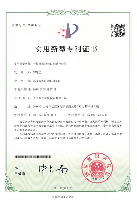 纸塑袋封口机控温装置-实用新型专利证书