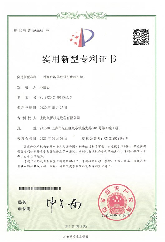 wpn07医疗泡罩包装机供料-实用新型专利证书