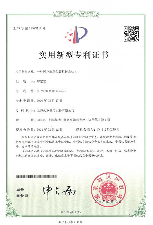 wpn07医疗泡罩转盘包装机-实用新型专利证书